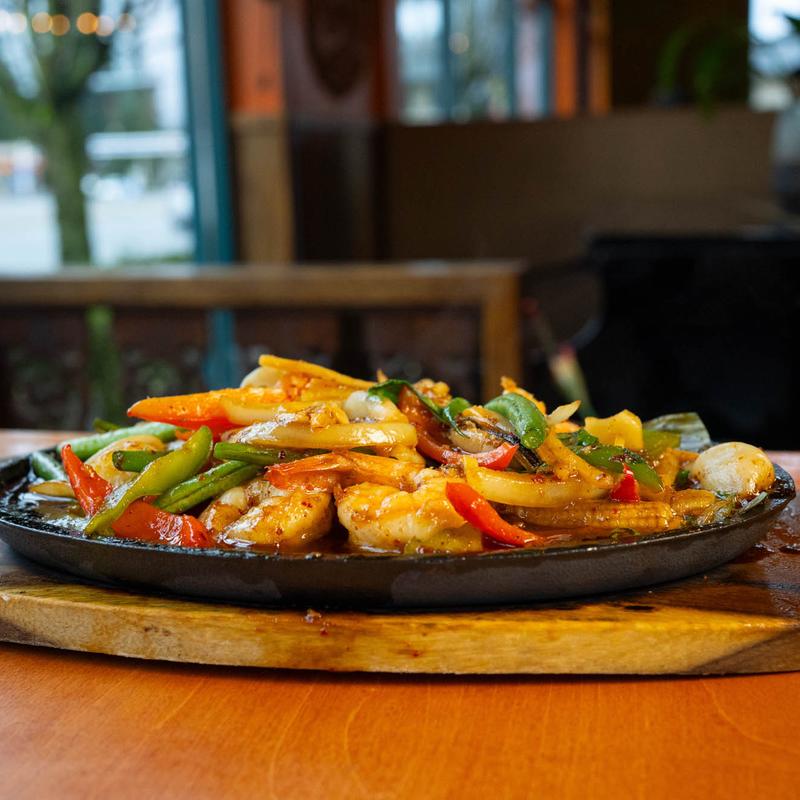 A tasty combination of seafood with bamboo shoots, baby corn, green beans, bell peppers, onions, and basil, stir-fried in chili sauce.